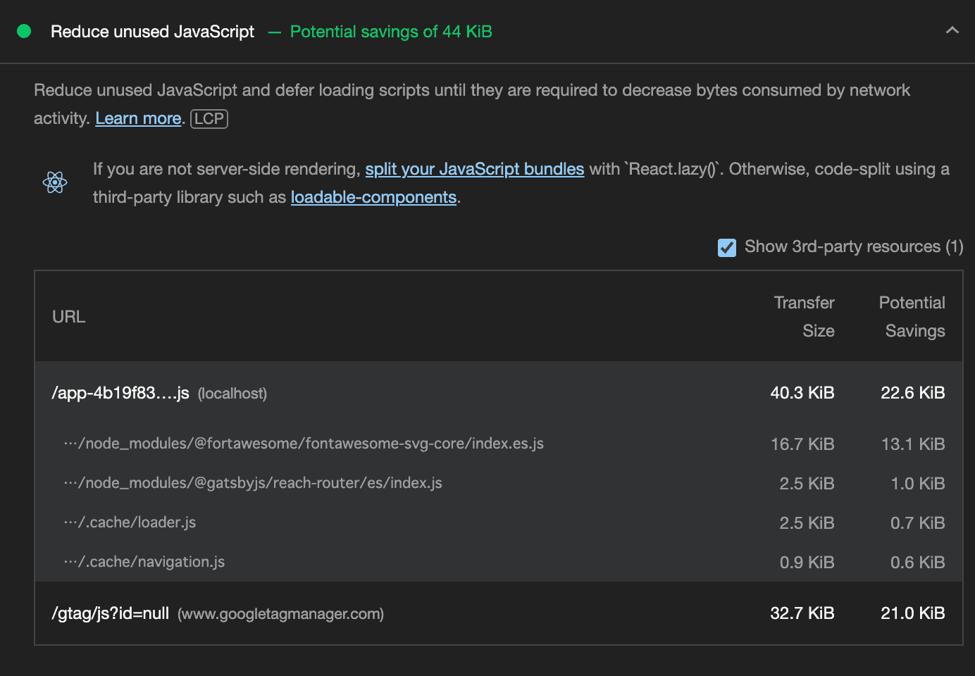 lighthouse の 'unused-javascript' のスコア算出方法がどうなっているのか次第ですが, またドツボにハマって「気楽に記事を書く」が達成できなくなるので, 今回は深追いするのはやめておきます。